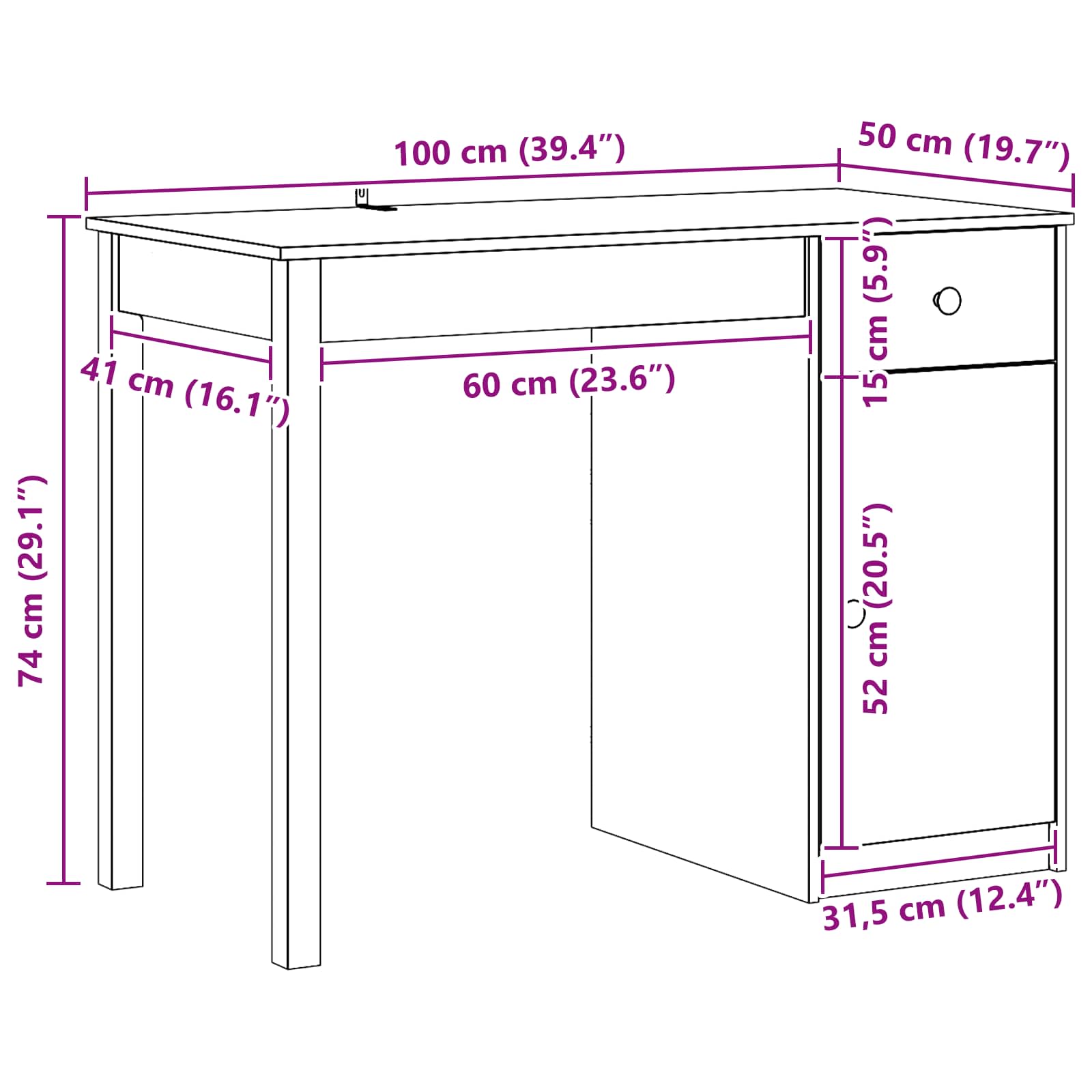 - Yleiset mitat: 100 x 50 x 74 cm (P x L x K)