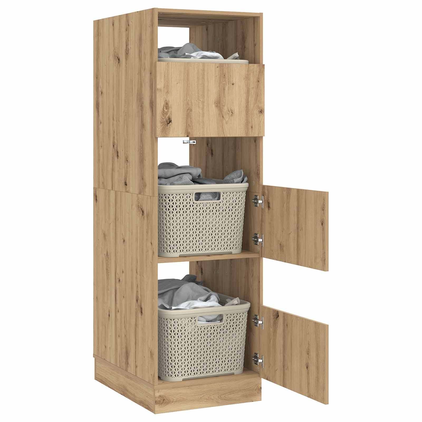 Tämä moderni pyykkikaappi yhdistää tyylin ja käytännöllisyyden. Sen suorakaiteinen muoto tuo ilmeeseen raikkautta, ja sileä pinta tekee siitä hieno valinta. Kestävä tekninen puu takaa pitkän käyttöiän ja viehättävän ulkonäön. Runsas säilytystila on täydellinen järjestystä rakastaville, jotka haluavat pitää kylpyhuoneensa siistinä.