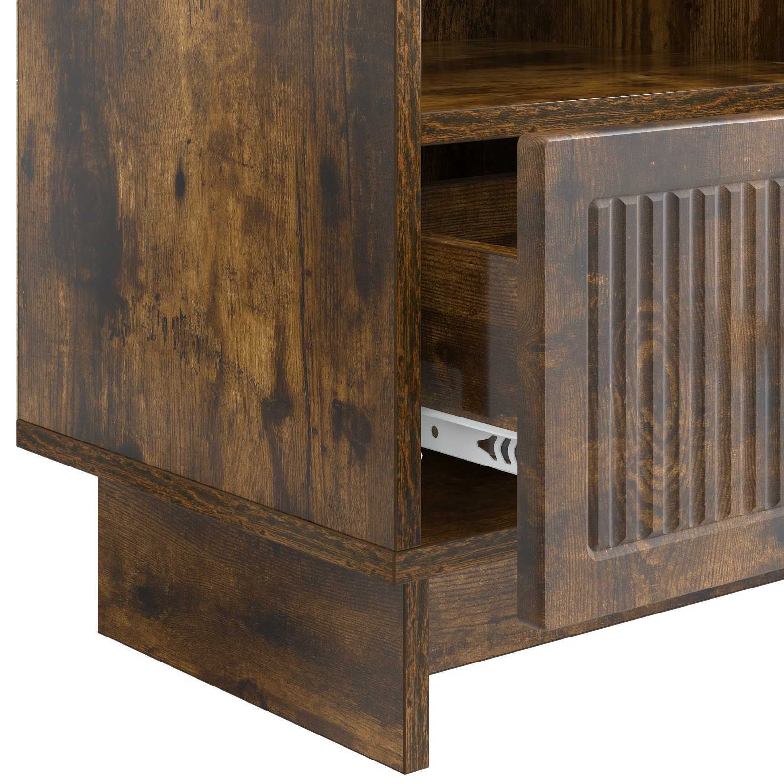 - Toiminnallinen säilytys: Kaapissa on runsaasti tilaa suurille lokerolle, mikä tekee siitä käytännöllisen ja kauniin valinnan. Elektroniikka ja tarvikkeet pysyvät järjestyksessä ja helposti saatavilla.